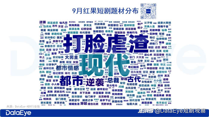 分析9月红果短剧的题材相关数据可以发现,9月前五名的题材均为:现代(265次)、打脸虐渣(229次)、都市(178次)、逆袭(158次)、古代(140次)。