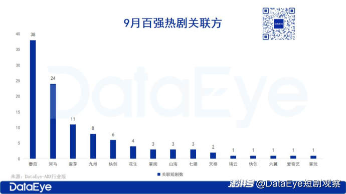 而从百强热剧的关联方来看,番茄遥遥领先,占38席,本期TOP5的微短剧中番茄占3席;河马位居第二,占24席;麦芽占11席,九州占8席,快创占6席。头部平台方呈现出明显的梯队分化趋势。