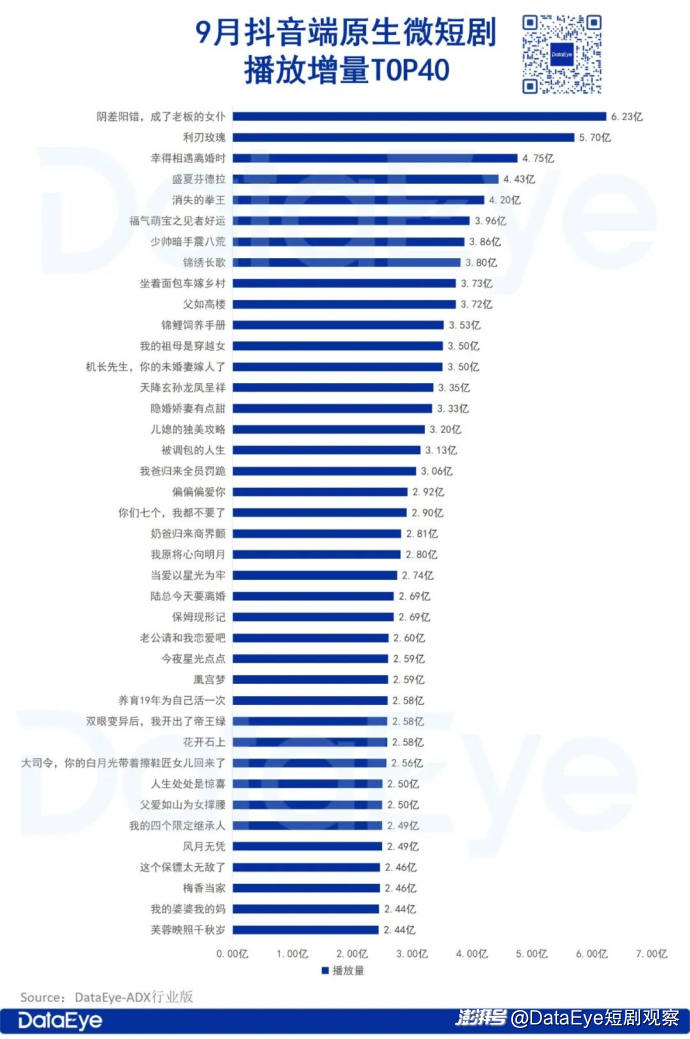 9月抖音端原生百强热播剧中,新剧占64部,较上期增加了19部。此外,有28部新剧闯入TOP40。TOP40的微短剧,播放增量共计128.39亿,40部微短剧播放增量均超2.4亿。