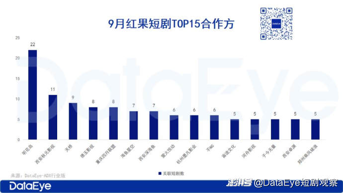从合作方角度来看,9月红果短剧生态呈现头部集中化与策略差异化的双重格局。9月在榜短剧数最多的是听花岛,共有22部微短剧在榜;其次是西安秋元影视,共11部微短剧在榜;第三是西安秋元影视共9部短剧。