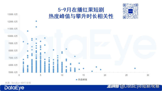 总体来看,攀升时长决定“爆款率”。从热度峰值与热度攀升的时长关系来看,部分超爆款短剧能够在5天内完成热度攀升。上榜热剧普遍能在10天内完成热度攀升,超出10天仍未突破7000万热度的微短剧可能面临淘汰风险!