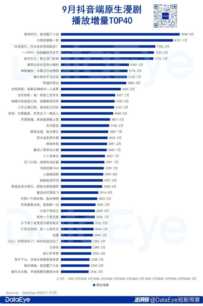 9月抖音端原生百强漫剧中,新剧占39部,有15部新剧闯入TOP40。值得关注的是,漫剧端原生本月累计播放增量达36.34亿,占本月抖音端原生播放增量大盘的2.14%。