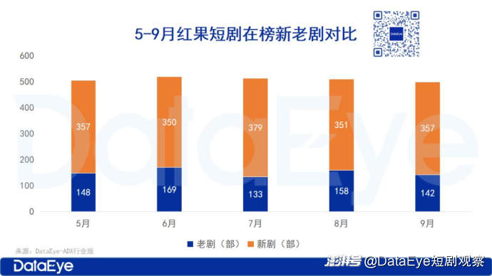 9月,登上过DataEye红果日榜的微短剧数量共499部,其中9月新上线的微短剧占357部,新剧占比达71.54%。在总数方面,变化不大,但在新剧方面较8月,新剧数量有所增加。