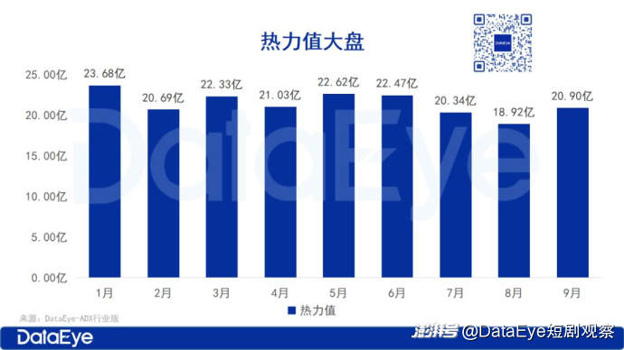 据DataEye短剧观察统计,9月微短剧大盘共消耗20.9亿,经历连续3个月下滑,9月热力值大盘重新回稳,较8月提升了10.43%。