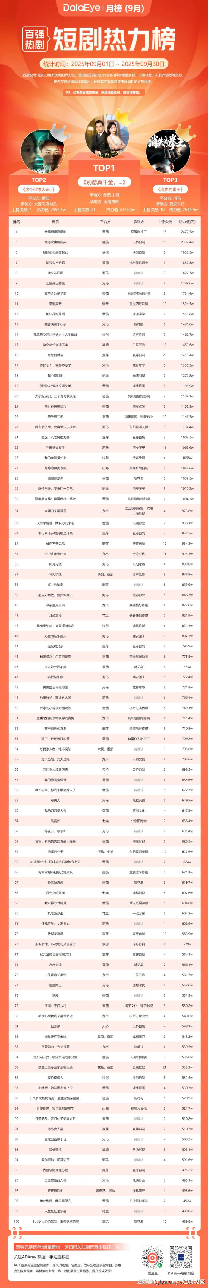 9月DataEye微短剧热力榜中,番茄,山海《别惹真千金,她爸是超级女儿奴》登顶,番茄《这个保镖太无敌了》第二,河马的《消失的拳王》位列第三。