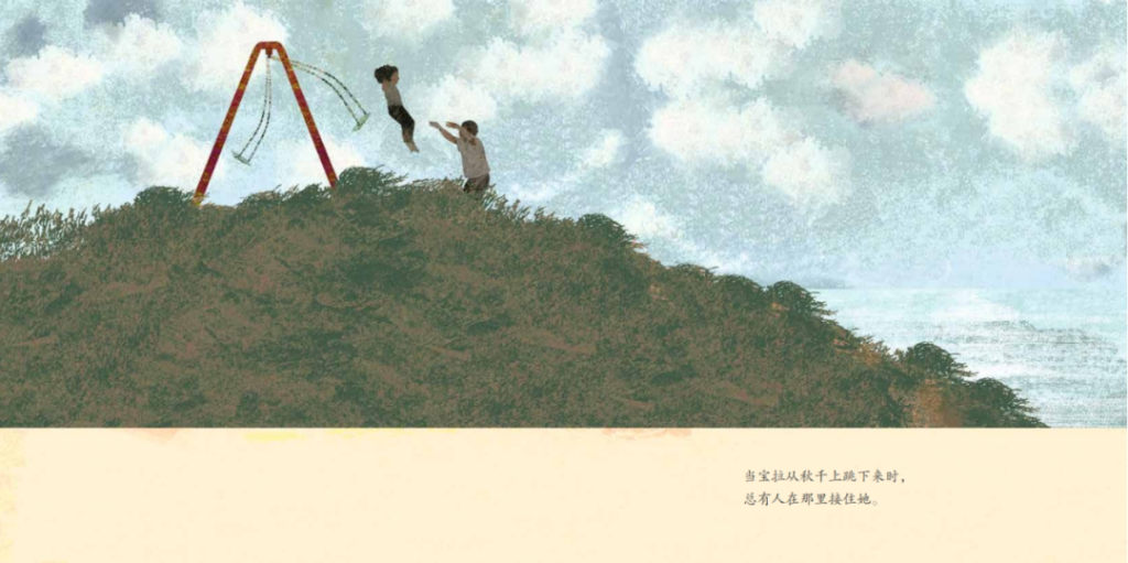 这是一本关于生命、记忆与时间之书。作者赋予了一架秋千以鲜活的生命感,使它拥有自己的状态与情绪。在书中,秋千静静地立于海边,仿佛永远不会改变;而它周围的世界却时刻流转,故事不断上演。秋千始终是那座秋千,但在不同人的记忆中,它又呈现出不同的模样。与此同时,书中的每一幅图画都经过细致考量与雕琢,于微末细节中传递着隐秘的情感。文字与图像的巧妙结合,共同营造出一种如秋千般轻盈摆荡、自由而诗意的氛围。
