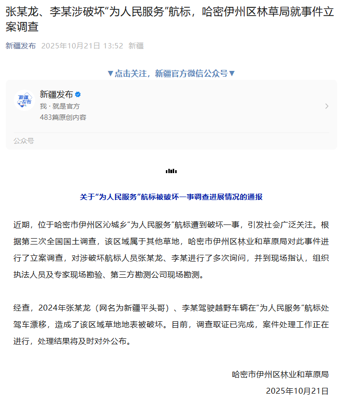 10月21日,哈密市伊州区林业和草原局发布关于“为人民服务”航标被破坏一事调查进展情况的通报: