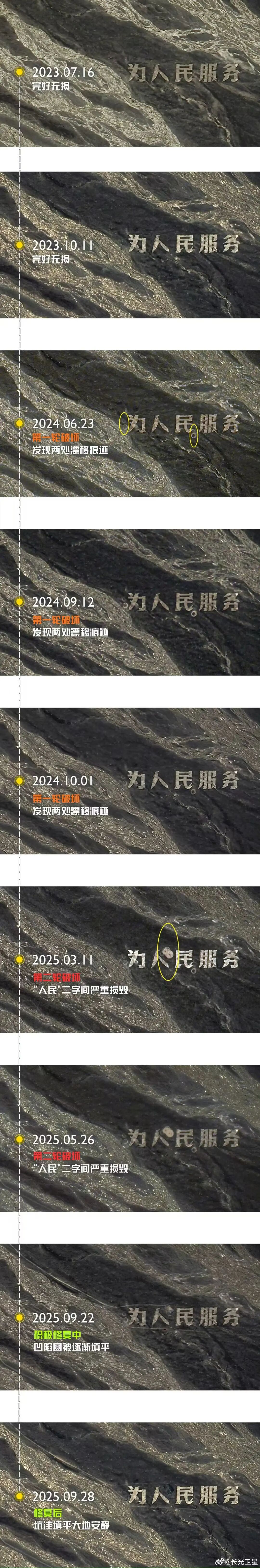 发布视频的博主陆遥,是一位历史地理爱好者,他发现哈密市伊州区沁城乡戈壁深处的“为人民服务”巨型航标字迹周边出现越野车碾压痕迹,随即自发组织修复,并通过卫星影像确认修复效果。随后,哈密市多部门现场勘查,迅速采取保护措施。