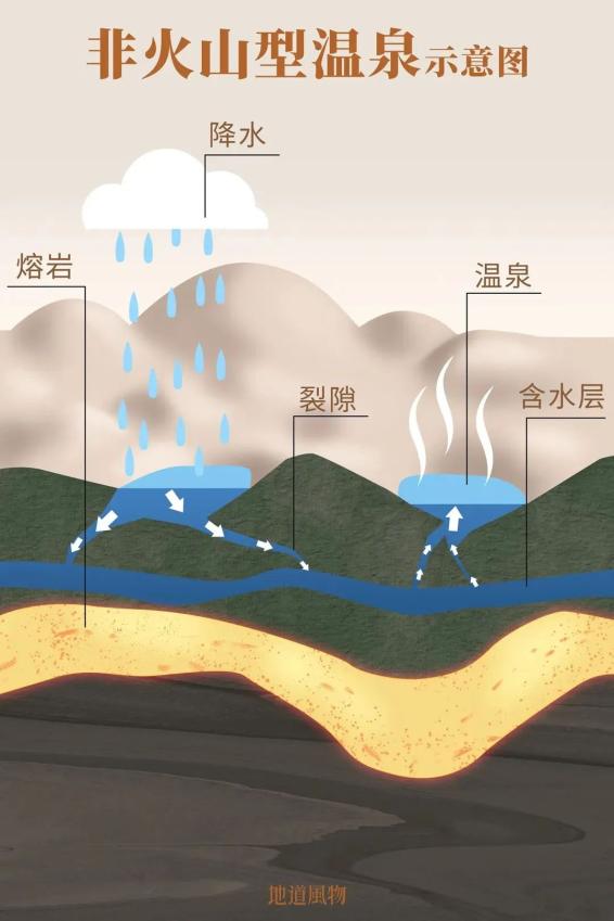 向左滑动火山型、非火山型温泉成因不同,形成的温泉也各有特色。