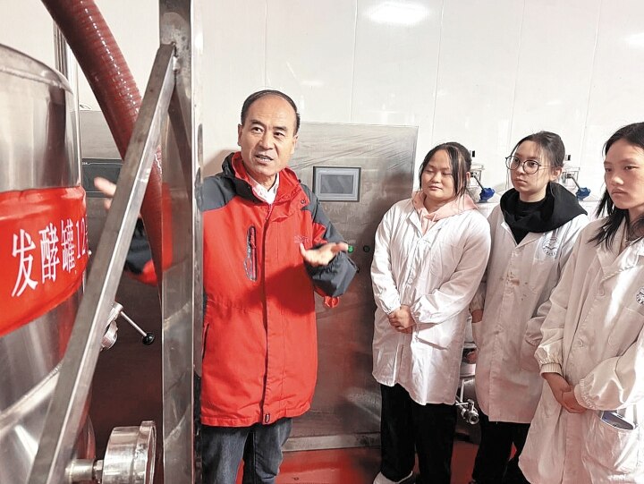 朗格斯酒庄(秦皇岛)有限公司总经理崔彦志给学生讲解葡萄酒发酵工艺。(图片由河北科技师范学院提供)