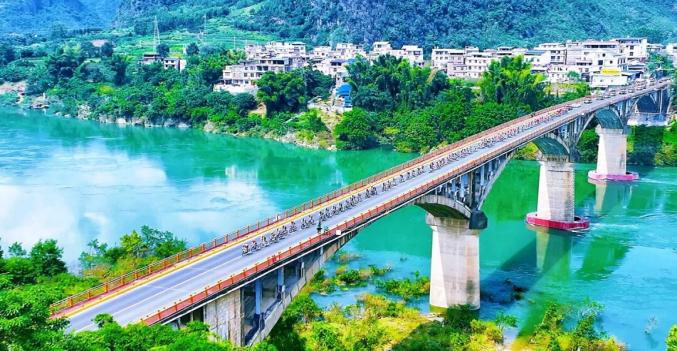 2025环广西公路自行车世界巡回赛现场,选手经过忻城县红渡大桥。(潘显高 摄)