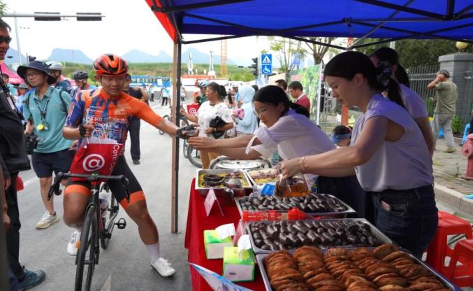 选手品尝特色美食。(冯俊铭 摄)此外,赛事同步举办的2025环广西大众赛暨沃拓挑战赛(第五赛段),特意将终点设在忻城县,形成“专业赛事+大众体验”的双向互动。