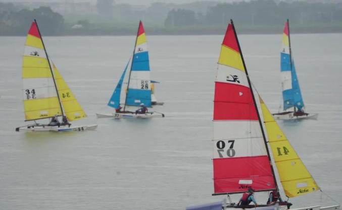 2025年广西帆船城市联赛(Hobie16级别)武宣站比赛现场。(资料图)回溯过往,2023年,来宾市成功承办第一届全国学生(青年)运动会赛艇、皮划艇(静水)两个项目。近年来,陆续承接广西青少年足球锦标赛、广西手球锦标赛、广西青少年篮球俱乐部城市联赛、广西万村篮球赛等自治区重要赛事,各类群众和青少年赛事层出不穷,全市每年举办各类赛事近200场,参与人数超10万人,既丰富了群众生活,也增强了市民体质。