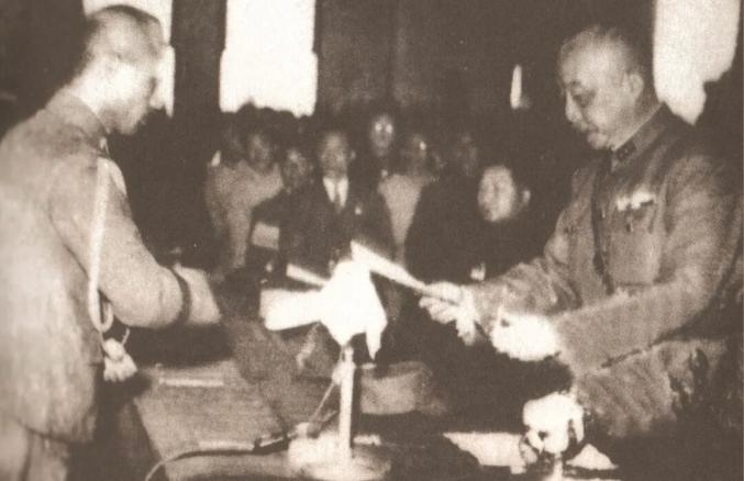 1945年10月25日,中国战区台湾省受降主官陈仪(右一)接受日本投降代表的投降书。中国闽台缘博物馆供图