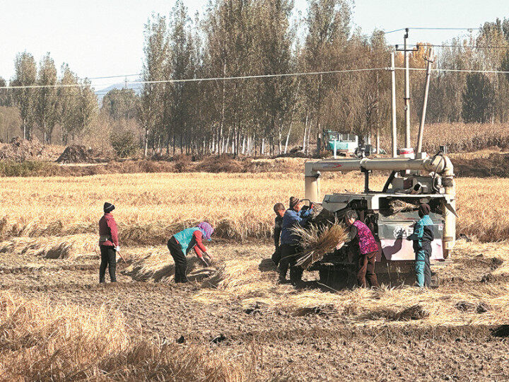 卢龙县印庄镇榆林甸村村民在砻谷机旁排队等待稻谷脱壳。通讯员 孟佳 摄
