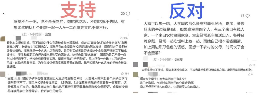 支持方认为这是“服务升级”,是多元选择的好事。不少学生在评论区留言:“外面酒店吃帝王蟹至少要一千五以上,学校拼团还便宜,偶尔聚餐多了个选择,没什么问题”“高校食堂不该只有大锅菜,有人想吃平价套餐,有人想偶尔改善伙食,只要定价合理就该存在”。还有学生提到,食堂本身有7元“学子套餐”,0.01元的爱心早餐和贫困生补助,“嫌贵可以选便宜的,没必要要求所有人都吃一样的,大学生该有自主选择的空间”。