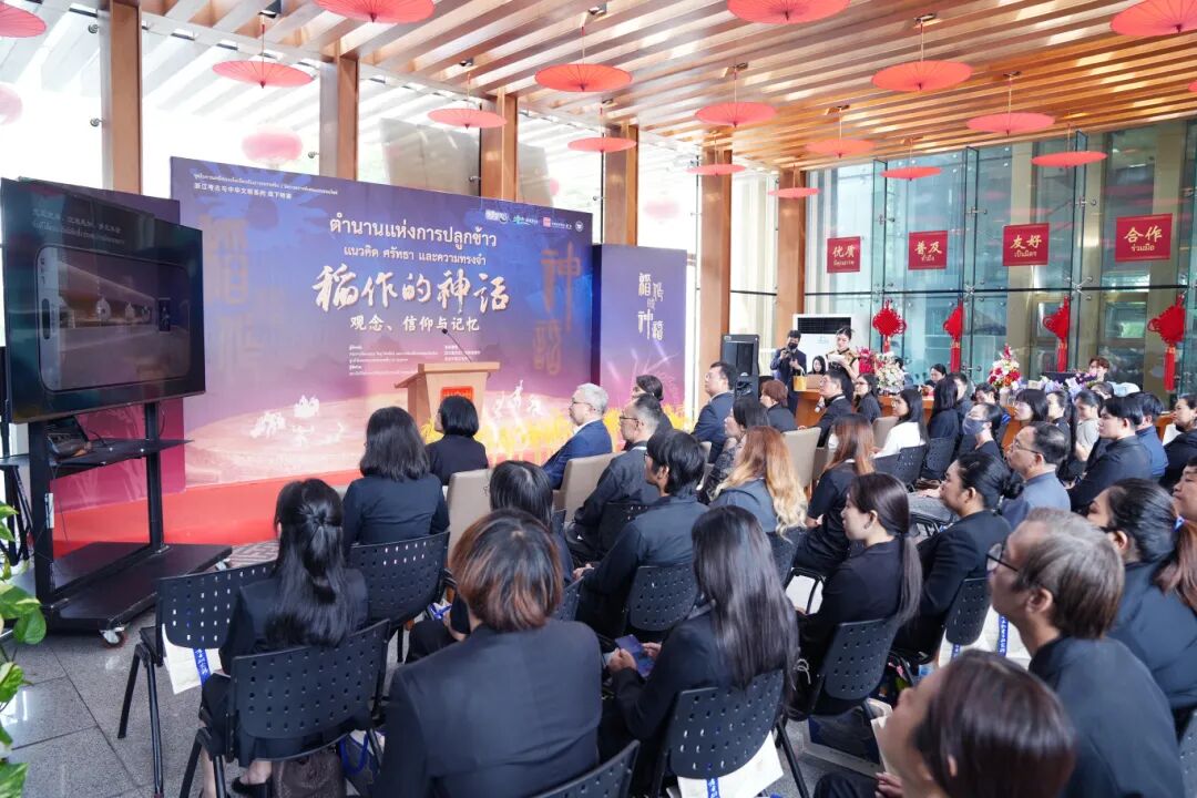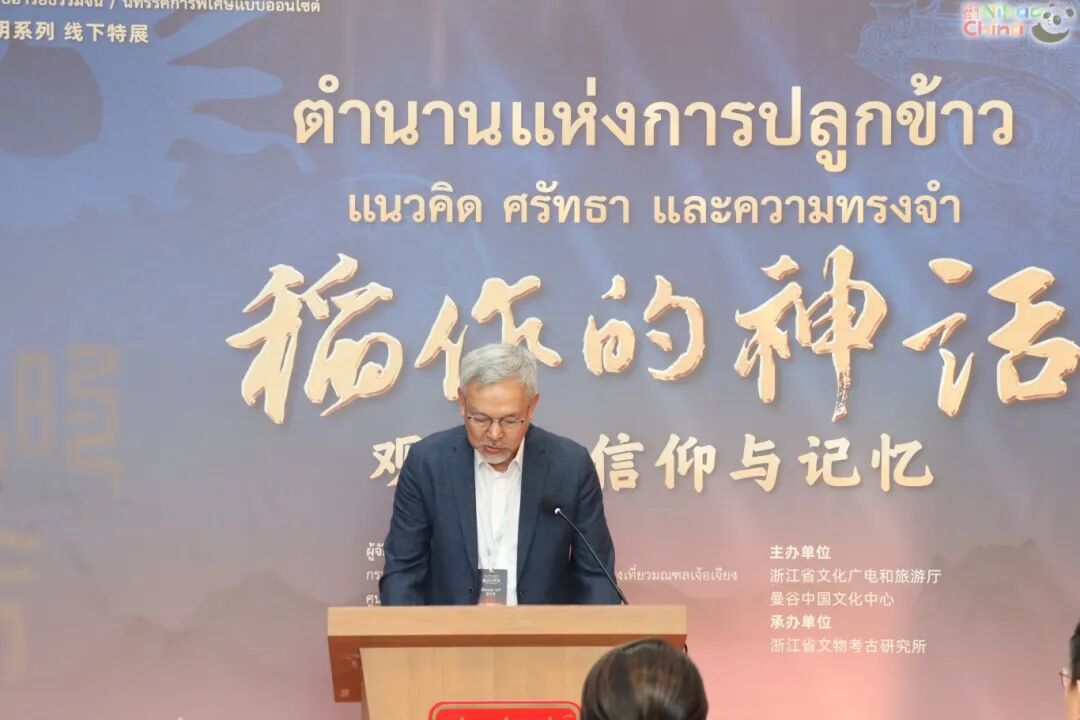 10月30日下午,由浙江省文化广电和旅游厅、曼谷中国文化中心联合主办,浙江省文物考古研究所承办的浙江考古与中华文明系列对外交流展——“稻作的神话:观念、信仰与记忆”线下特展在曼谷中国文化中心开幕。泰国文化部副次长初迪嘉·阿卡拉吉索帕昆,曼谷中国文化中心负责人张若愚,浙江省文物考古研究所所长方向明,甘亨碧国家博物馆馆长、文物保护特级专家诗琳·媛雅迪,泰国植物考古专家帕拉米塔·蓬翁博士,玛希隆大学科学学院植物科学系助理教授萨西维蒙・斯旺波尔博士,以及中泰文化界友好人士等60多名嘉宾出席开幕活动,共赴这场稻作文明的对话之约。