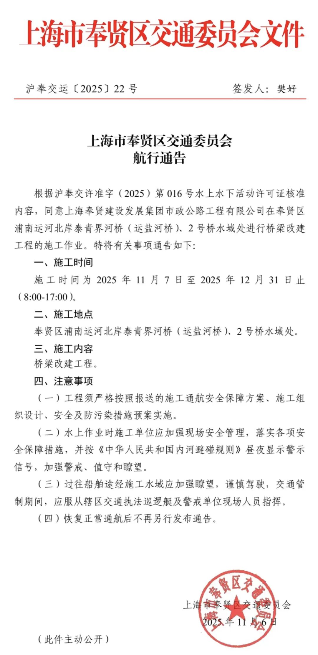 根据沪奉交许准字(2025)第016号水上水下活动许可证核准内容,同意上海奉贤建设发展集团市政公路工程有限公司在奉贤区浦南运河北岸泰青界河桥(运盐河桥)、2号桥水域处进行桥梁改建工程的施工作业。特将有关事项通告如下: