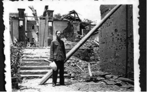 厦门大学萨本栋校长在被炸毁的校舍前。