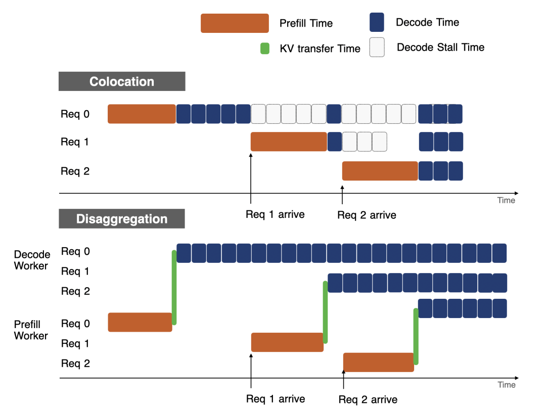 如上图(上),当prefill(橙色)与decode(蓝色)同址部署时,两者互相干扰,导致decode阶段停滞;上图(下),当将prefill与decode分离到不同机器时,两者即可无干扰地顺畅运行。