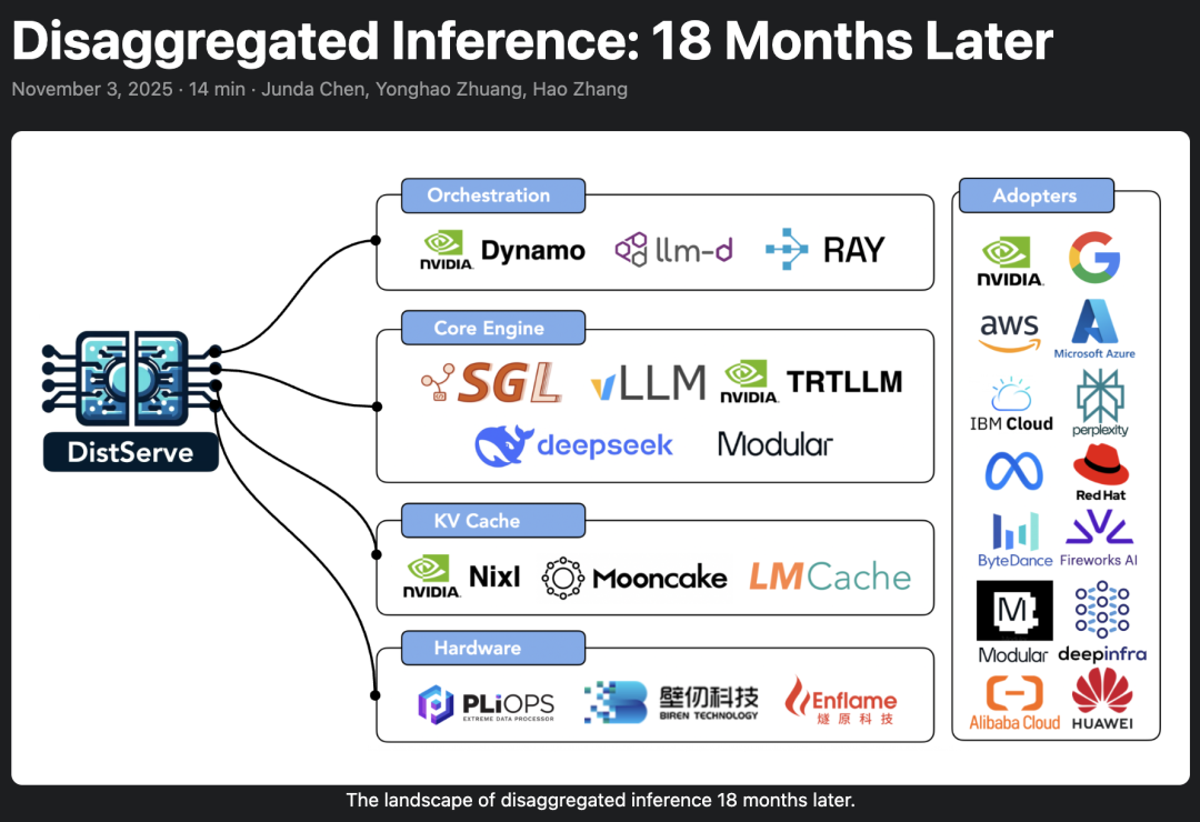 几乎所有与大模型推理相关的生产级框架——从编排层、推理引擎、存储系统,甚至到新兴的硬件架构,都以某种形式采用了这一解耦推理的思想。