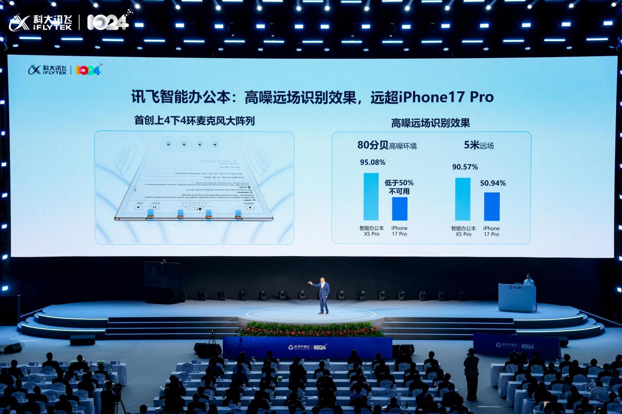 讯飞办公本X5首创上4下4环麦克风大阵列,搭载360°声源定位与智能降噪技术。现场演示在高分贝环境中以及1米、3米、5米的不同距离的识别和转写,其效果远超iPhone 17 Pro。基于星火X1.5的说话人识别与语义理解能力,X5能自动区分不同发言人、识别会议主题、提取关键观点,并生成结构化AI纪要与待办事项,形成从“听清”到“听懂”,再到“行动”的智能闭环。