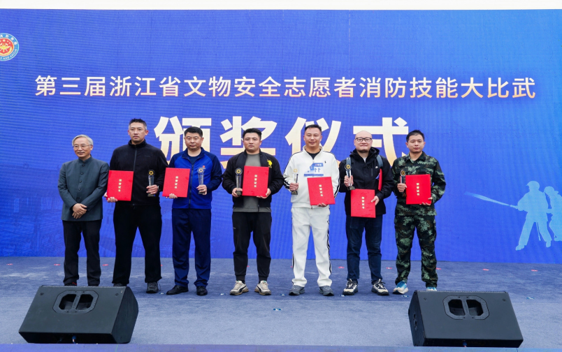 大比武过程中,参赛选手斗志昂扬、顽强拼搏、奋勇争先,经过激烈角逐,决出团队一、二、三等奖和优胜奖,其中缙云县河阳管理中心志愿消防队和省博物馆志愿消防队分别摘得文物建筑组、博物馆组团队桂冠,义乌市佛堂镇大成社区志愿消防队金鹏浩、省博物馆志愿消防队何鹏程分别获得文物建筑组、博物馆组“防火检查”单项冠军,省博物馆志愿消防队吴中华获“连接操”单项冠军,省博物馆志愿消防队赵清磊获“灭火操”单项冠军,省博物馆志愿消防队获“水枪操”冠军。