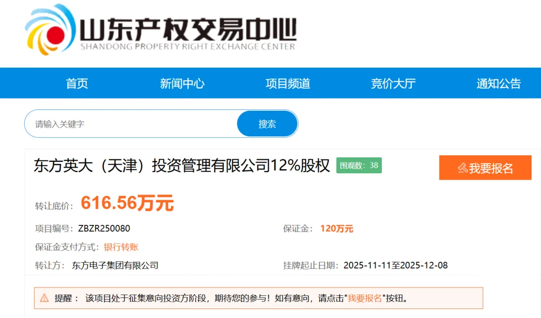 经济导报记者刘勇11月11日,东方英大(天津)投资管理有限公司(下称“东方英大”)12%股权在山东产权交易中心挂牌转让,转让底价为616.56万元,转让方为东方电子集团有限公司(下称“东方电子集团”)。