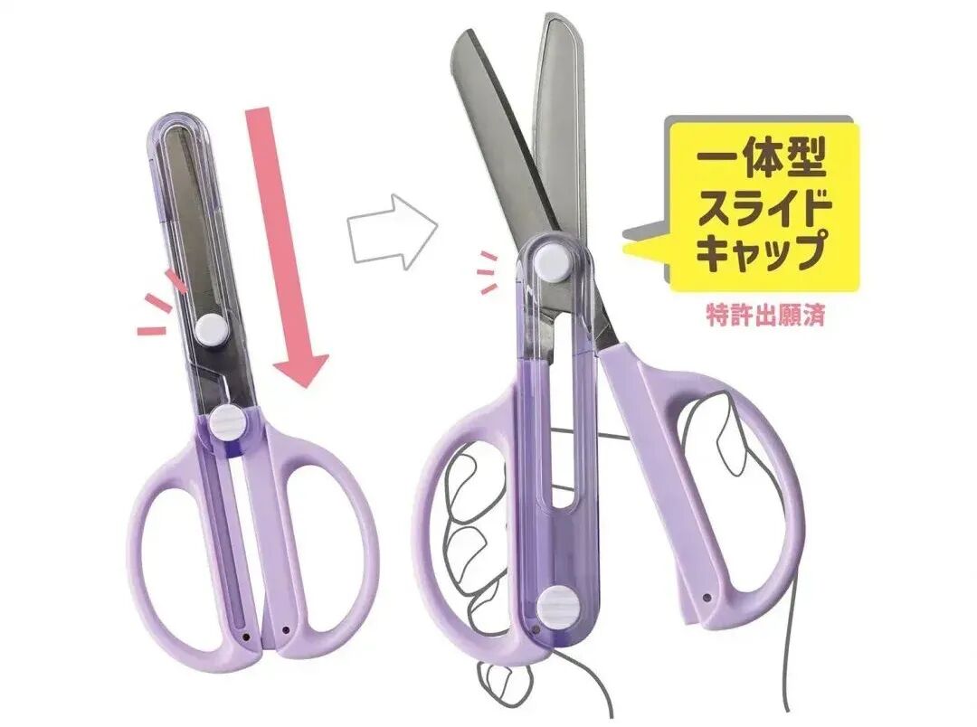 |往下一拉,保护套就滑动到手柄,正常使用;往上一拉,保护套就把剪刀罩住,避免伤手。还有为左撇子准备的左手款剪刀。