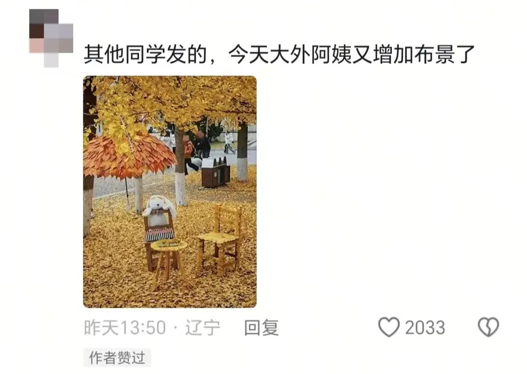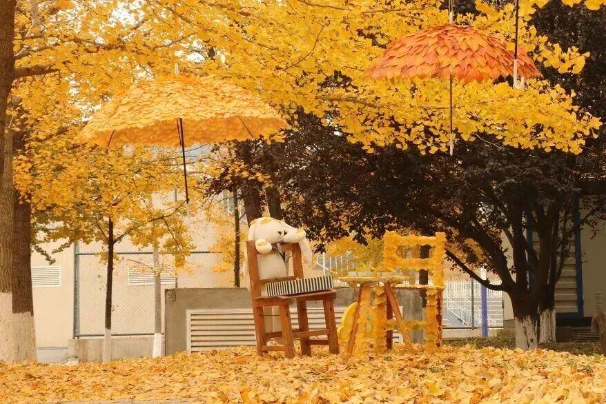 这场面也太唯美了用银杏叶粘满的椅子、桌子上还放了个毛绒小熊