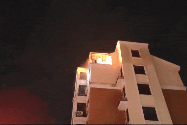 烟花引燃了阳台杂物,冒起了火光,阵阵黑烟飘出窗外。消防员到场将火势扑灭,所幸未造成人员伤亡。