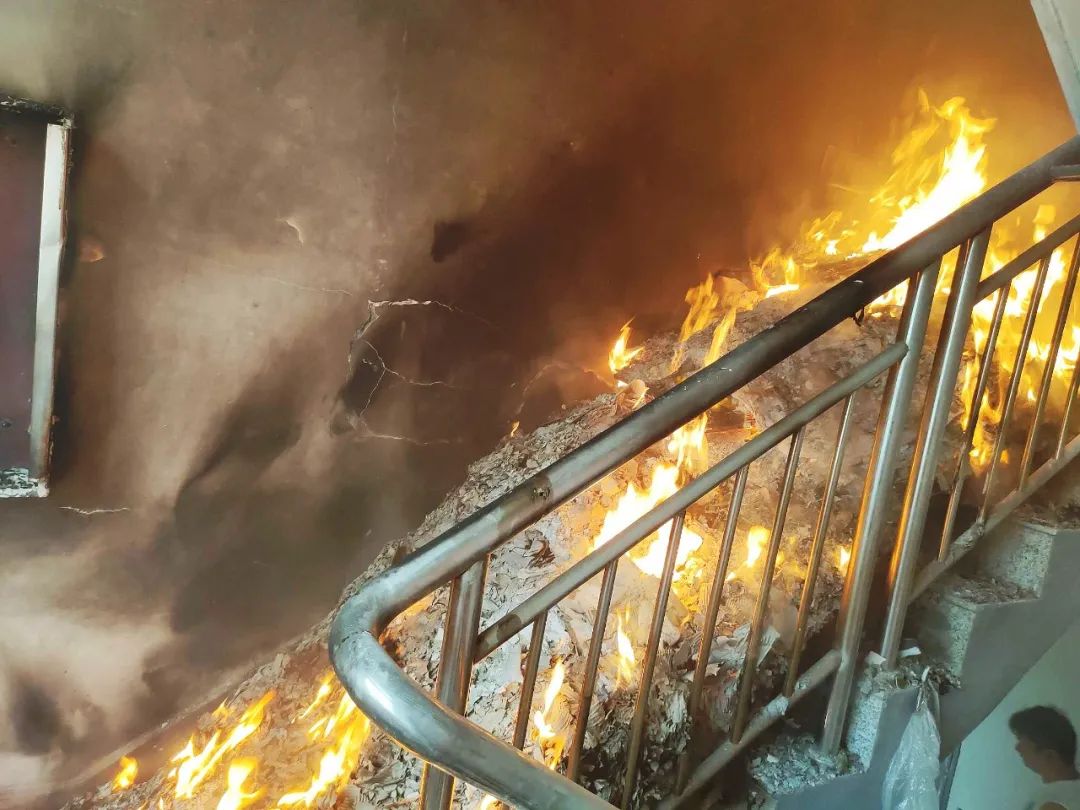 2025年7月,江西高安,一居民楼楼道内突发火灾。消防员到场经勘察,发现起火物为楼道口堆积的废旧纸箱、塑料等杂物。为防止火势进一步蔓延,消防员立即出水枪压制火势。所幸处置及时,未造成人员伤亡。