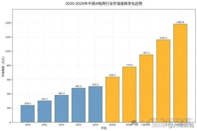 头豹研究院日前发布《2025年AI电商行业词条报告》,显示2020年至2024年,AI电商行业市场规模从239.27亿元增长至504.45亿元,年复合增长率达20.50%。预计2025年至2029年,市场规模将从638.24亿元增长至1,382.81亿元,年复合增长率预期达21.32%。