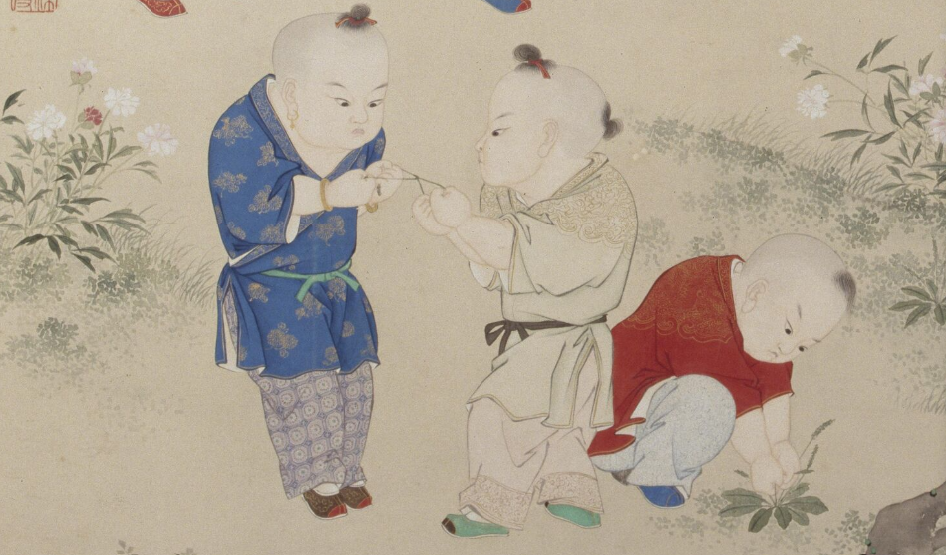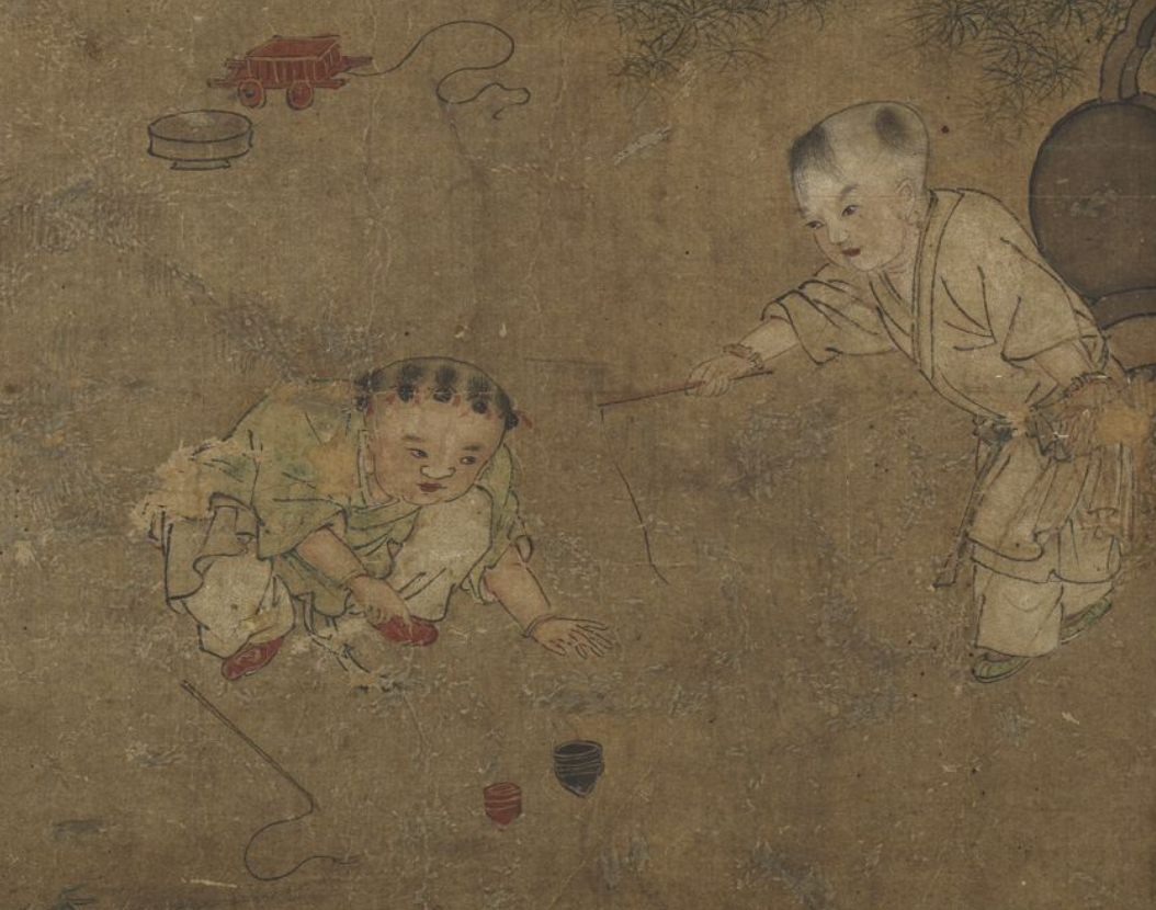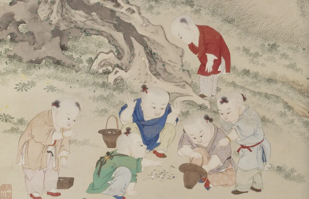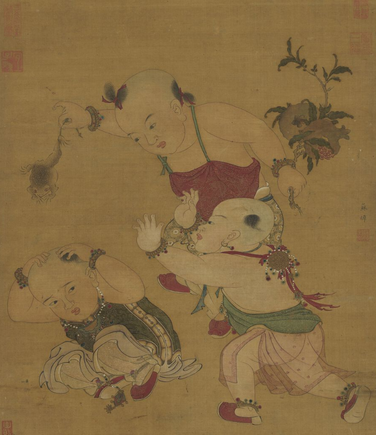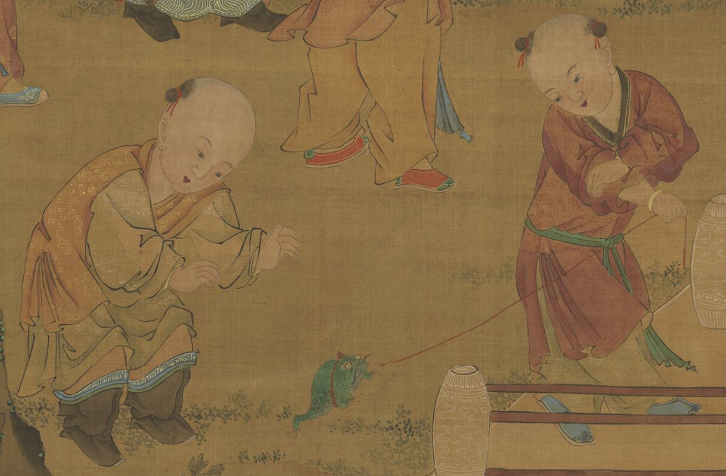 古代“婴戏图”专画憨态可掬的大头儿童的各种生活场景与游戏。据说婴戏图与人口政策相关。官方画院鼓励婴戏图创作,推动人口增长。于是画家借童孩,表达无忌的童趣:如一宋代小儿手拿蟾蜍,吓唬另一小儿,惊恐的孩子两手捧头,缩成一堆儿;又或者元代两个皮孩子以绳系蟾蜍,一前一后戏之。