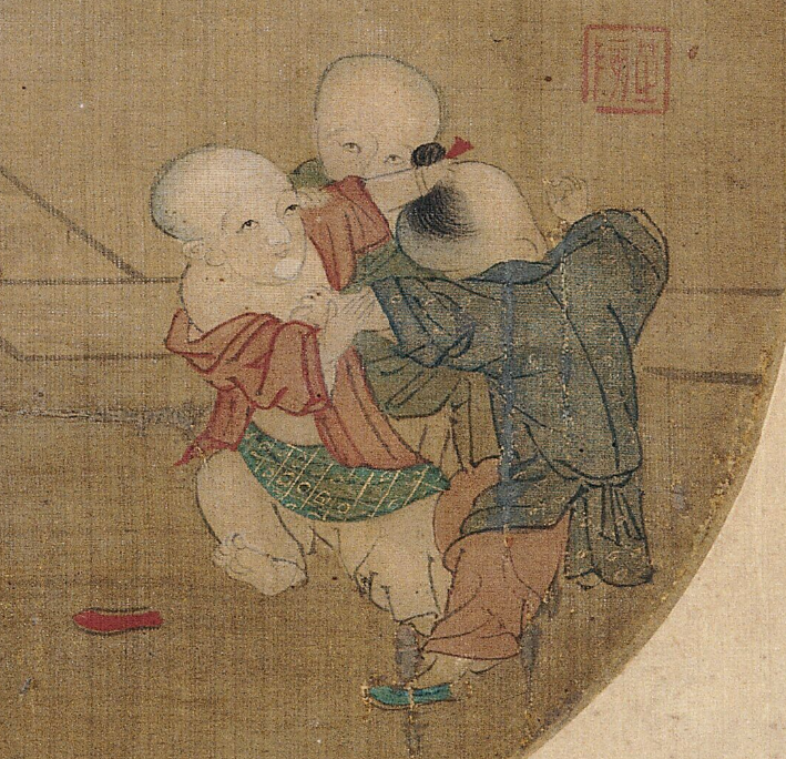 苏汉臣是宋代著名的婴戏与货郎图画家,他的《秋庭婴戏图》局部,两个小孩扭打在一起,有小辫子小孩被揪住,光头的则没事,但衣服也被扯开了。正因为画的是小儿,才令人发笑。