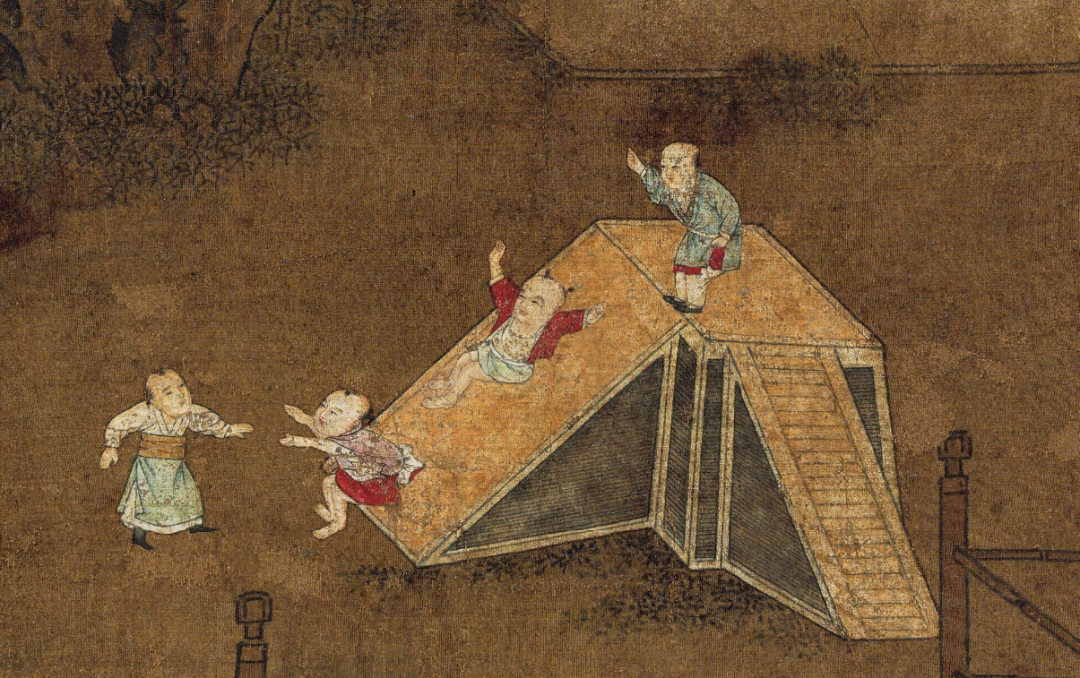 婴戏图里游戏多,“打陀螺”是一种古老的民间游戏。倒圆锥形的陀螺,北京也叫“焊尖”,谐音抽“汉奸”。打的好的,陀螺在地上千千转、转不停。不会打的,陀螺很容易乱滚,倒在地上,称为“死陀螺”。“滑滑梯”则让人看到宋代滑梯的营造方式。
