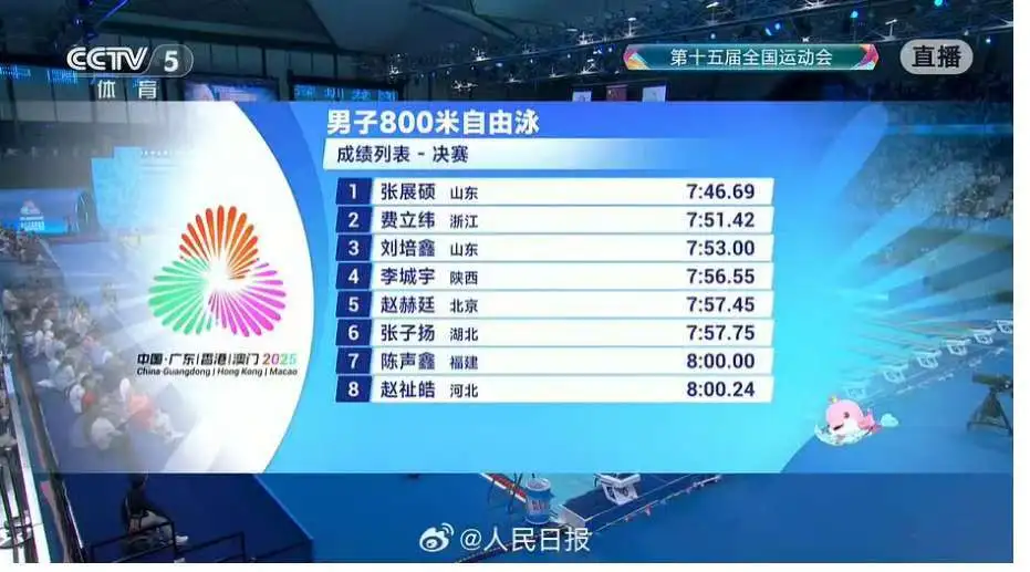 今晚,在十五运会男子800米自由泳决赛中,年仅18岁的青岛籍世界冠军张展硕以7:46.69的成绩勇夺冠军,摘得在本届全运会上的第三枚个人金牌。此前,张展硕先后获得男子400米自由泳和200米自由泳冠军。