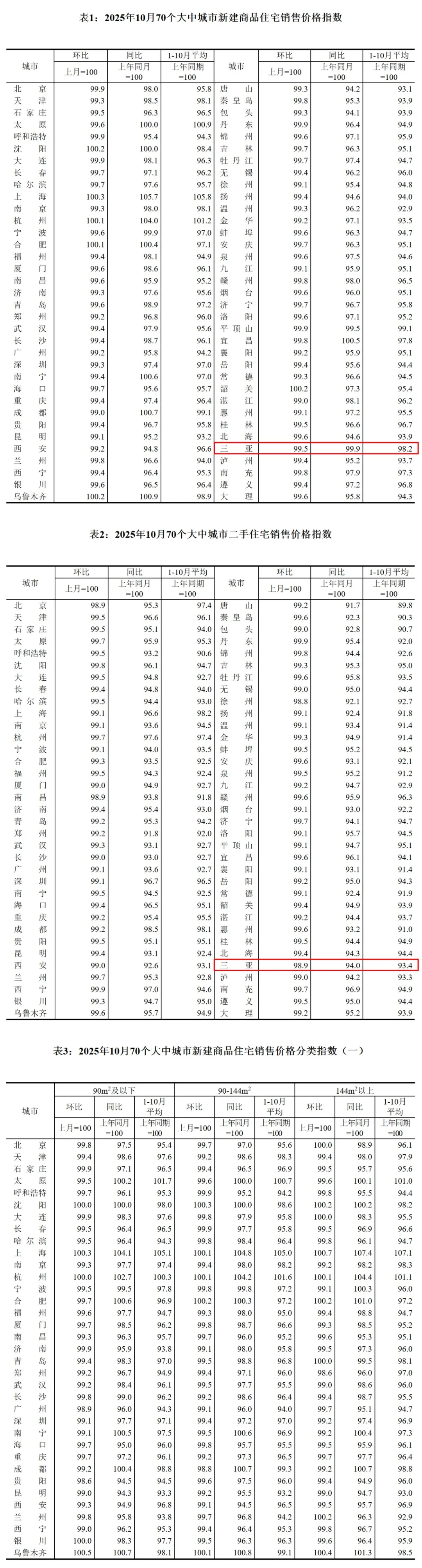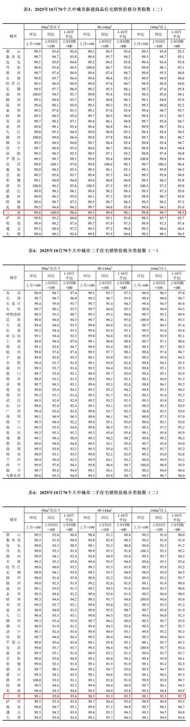 11月14日,国家统计局发布2025年10月份70个大中城市商品住宅销售价格变动情况。三亚新建商品住宅销售价环比下降0.5%,同比下降0.1%;二手住宅销售价环比下降1.1%,同比下降6%。