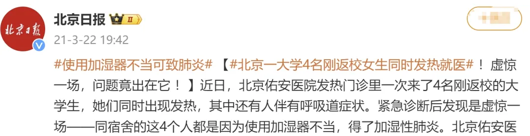 2021年,4名大学女生同时发热,最后发现是“加湿器肺炎”[1]。