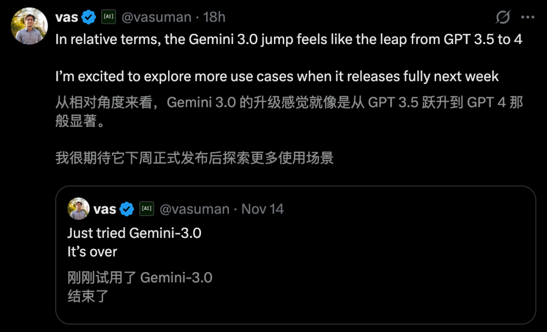 提前上手的AI大牛毫不夸张地称,Gemini3.0这次飞跃,其相对意义堪比从GPT-3.5到GPT-4的巨大跨越。