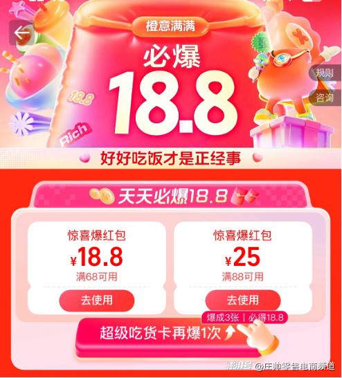 饿了么回应显得格外淡定,发起“好好吃饭才是正经事”的活动,消费者搜索“正经事”、“小黄”等关键词进会场,直接拿到18.8元的餐补红包,直击用户外卖省钱和配送到家安心吃饭的的核心诉求。