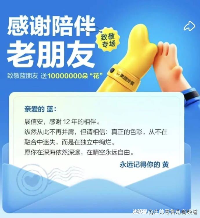 另外美团在这场“致敬小蓝”的公开信中提到“不再并肩、迷失”等词语暗示饿了么的消失,这样的表述显然不妥也不合时宜。