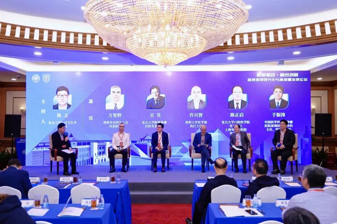 圆桌论坛上,深圳大学医学部执行主任许兴智,复旦大学附属肿瘤医院党委书记吴炅,复旦大学口腔医学院党委书记、上海市口腔医院党委书记陈正启,深圳市光明区人民医院院长方智野,中国医