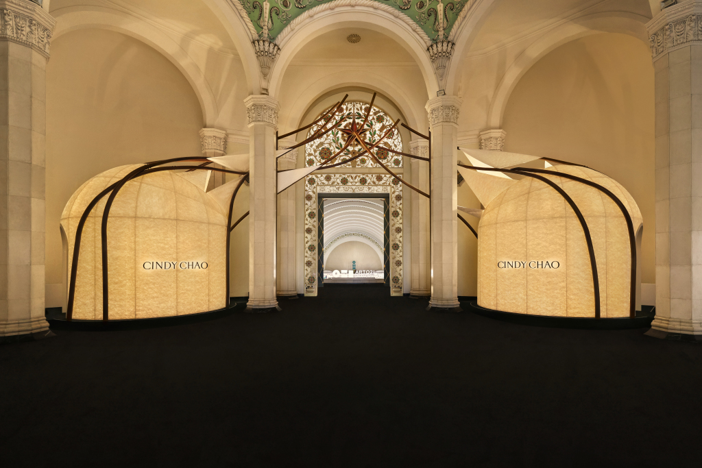 时隔两年回归,CINDY CHAO没有采用传统的柜台式陈列,而是以蒙古包造型为灵感的大型建筑艺术装置作为其展区主体。该装置灵感源自艺术家Cindy Chao的蒙古草原之行,将游牧民族的“蒙古包”与植物的“根脉”意象融合,构建了一个充满结构感与生命力的空间。