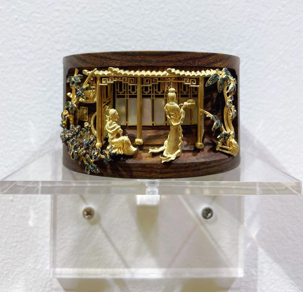 这种身份的重塑,也发生在另一位参展的珠宝艺术家翁狄森(Dickson Yewn)的作品里。翁狄森带来了新品——具有东方文人意趣的新作“梨香院听《牡丹亭》”手镯。作品以胡桃木为镯身,内部以黄金、贝母、钻石和沙弗莱石等材质,微缩再现了《红楼梦》中黛玉听曲的经典场景。细细观看,它更像是一件案头赏玩的文人器物,而非日常佩戴的饰品。