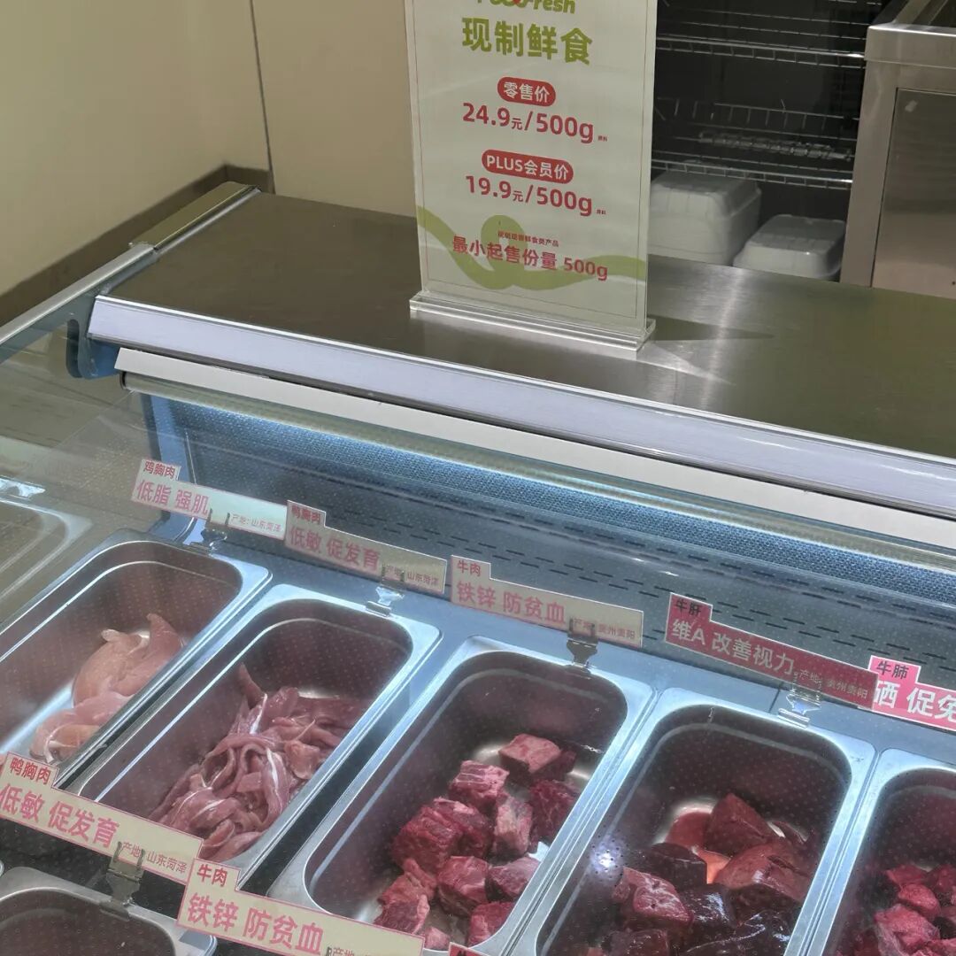 派特鲜生的自助鲜食价格在24.9元/斤左右,可选品类包括鸡胸肉、牛肉、三文鱼等,从定价来看并不算贵,但不少顾客在店内看到实物后认为“品质不值价格”,这一价格可以在盒马、永辉等普通超市买到更新鲜的食材。在社交平台上,对派特鲜生诸如“食材不够新鲜”的投诉声不断,甚至出现许多宠物吃完拉肚子的反馈。