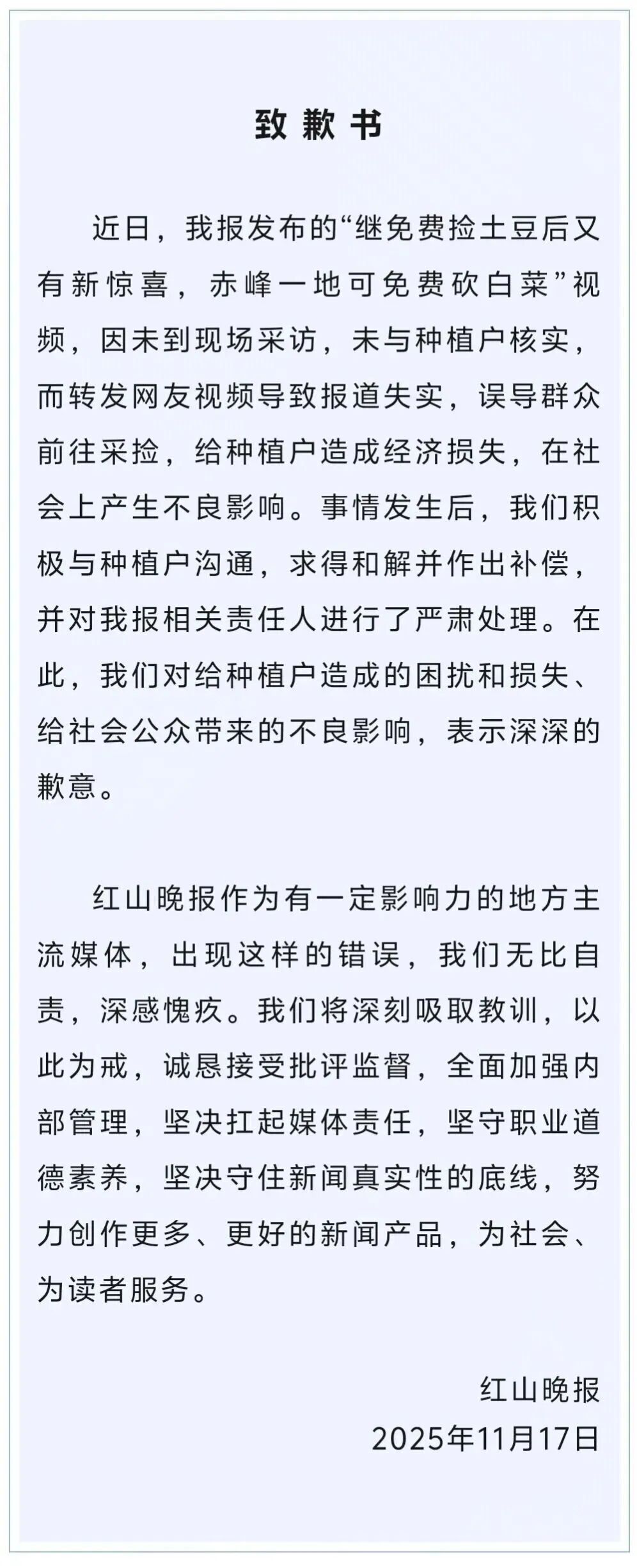 17日晚,红山晚报通过微信公众号发布致歉书称,“我们对给种植户造成的困扰和损失、给社会公众带来的不良影响,表示深深的歉意。”