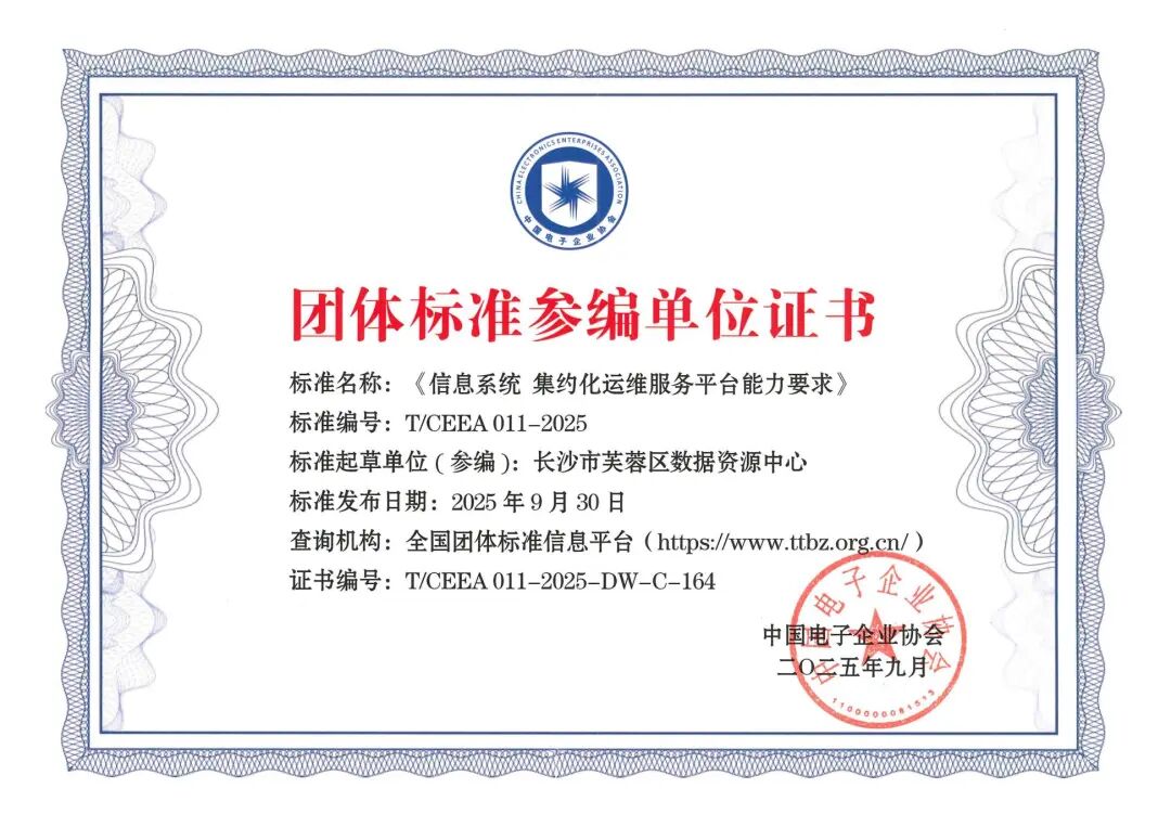 近日,由长沙市芙蓉区数据资源中心与中国电子企业协会研制的《信息系统集约化运维服务平台能力要求》在全国团体标准信息平台正式发布。该标准的出台,填补了国内在集约化运维工具研发与评价规范方面的空白,为数智时代背景下政务信息系统的运维与保障提供了行业规范。