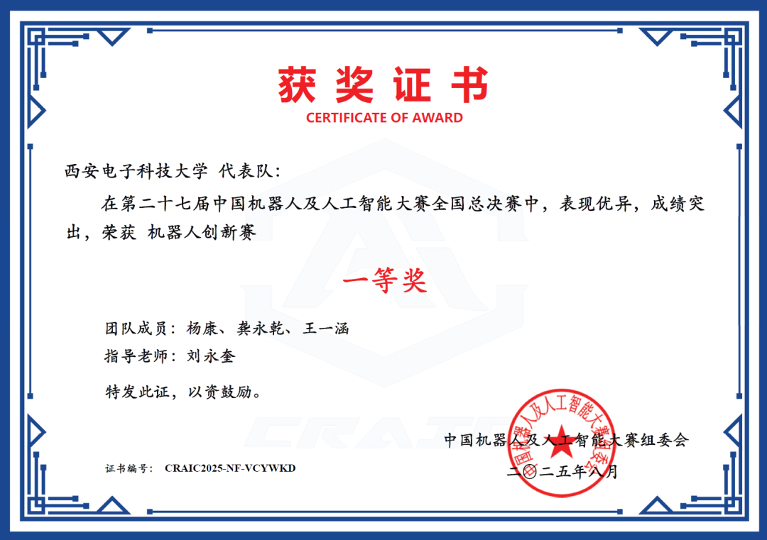 ,是刘永奎培养学生创新与实践能力的重要途径。他积极指导学生参加中国机器人及人工智能大赛、全国大学生机器人大赛RoboMaster、RoboCom机器人开发者大赛、“申昊杯”中国研究生机器人创新设计大赛等各类国家级高水平机器人竞赛,累计获奖20余项,多次斩获全国一等奖、二等奖等高级别奖项。