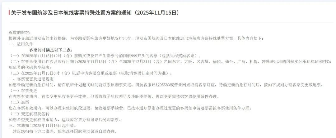 以国航为例,在通知中明确表示,对于在今年11月15日12时(含)前购买或换开产生新票号的国航999开头的客票(包括里程奖励客票),此外,客票未使用行程涉及旅行日期为2025年11月15日(含)至2025年12月31日(含)之间东京、大阪、名古屋、福冈、仙台、广岛、札幌、冲绳进出港的国航实际承运航班和挂CA航班号的代码共享航班等多个情况下,在客票有效期内,可以办理未使用航段退票,免收退票手续费。